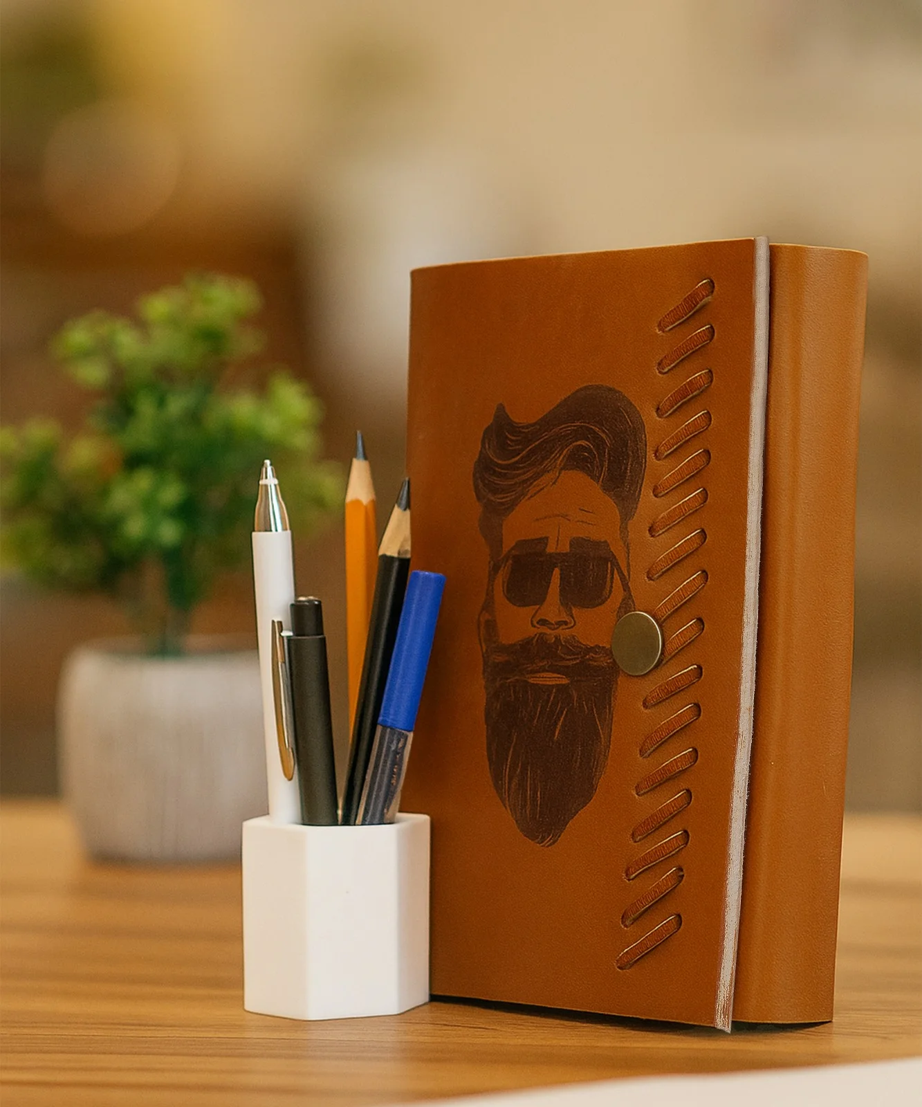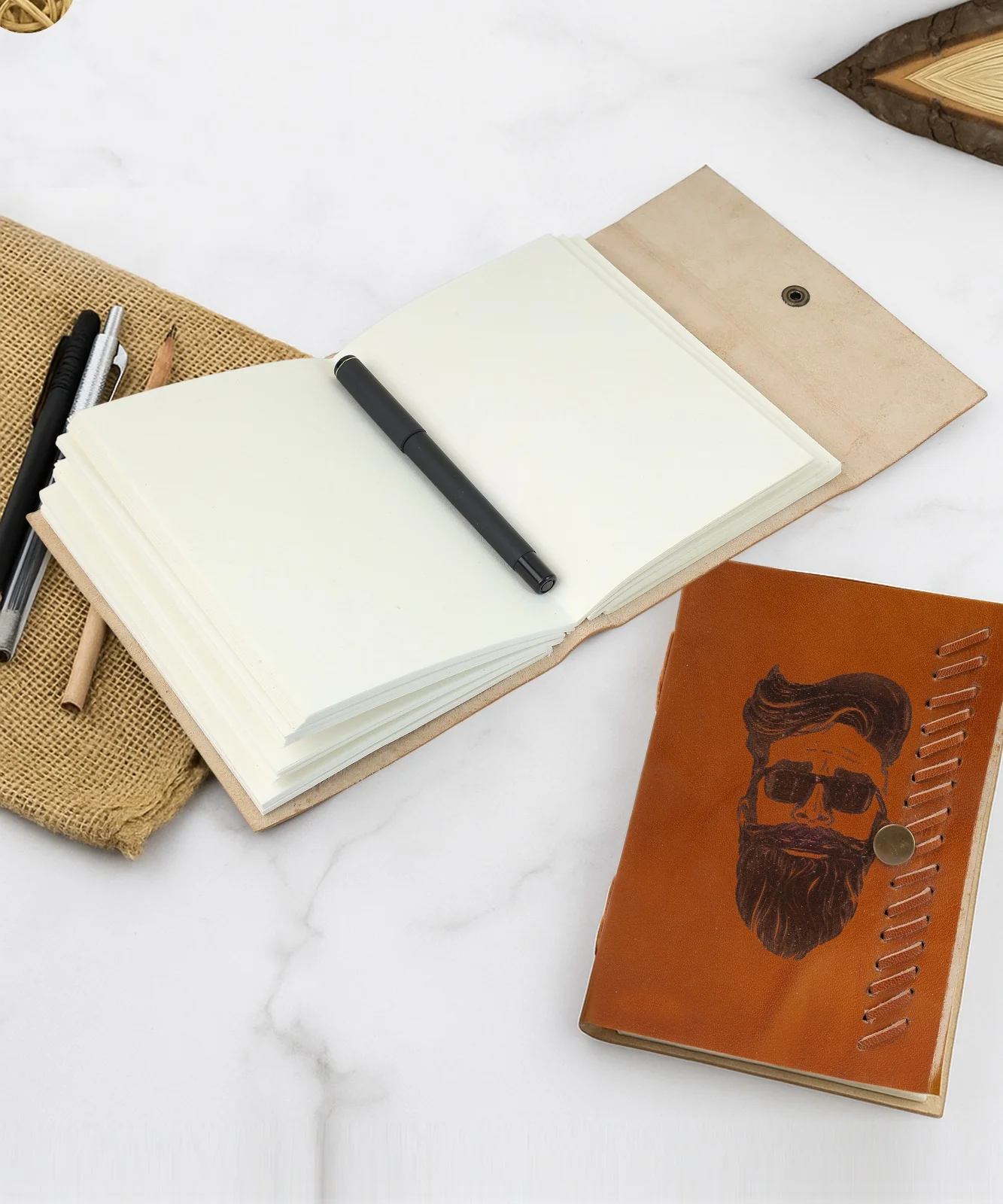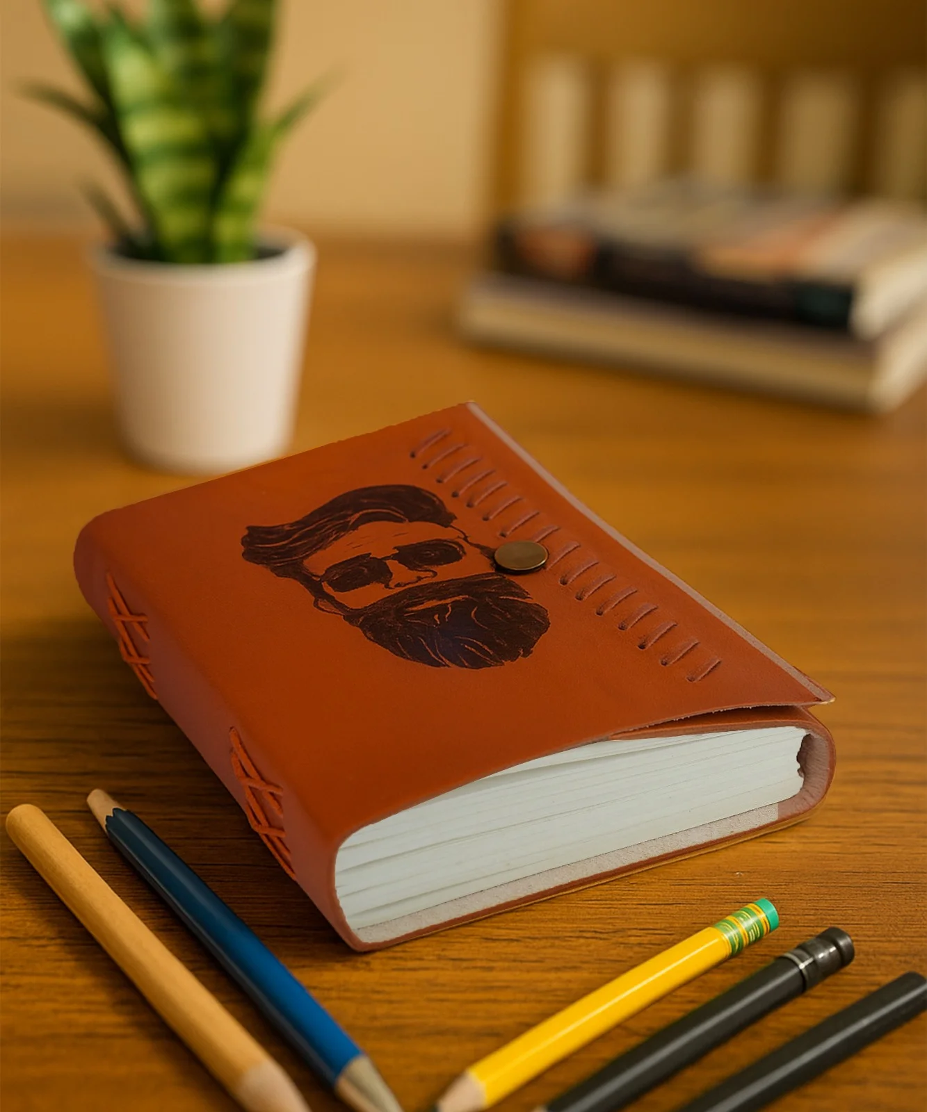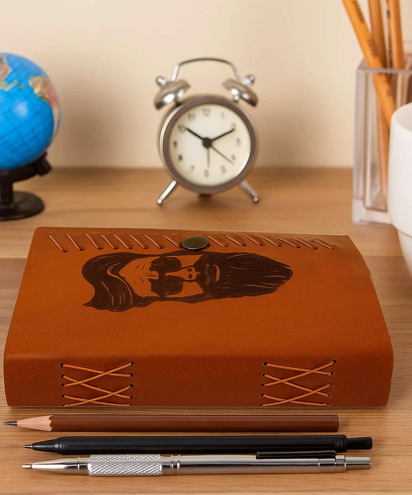 A handcrafted leather journal with artistic embossing, durable stitches, and an eco-friendly cotton-waste paper interior.