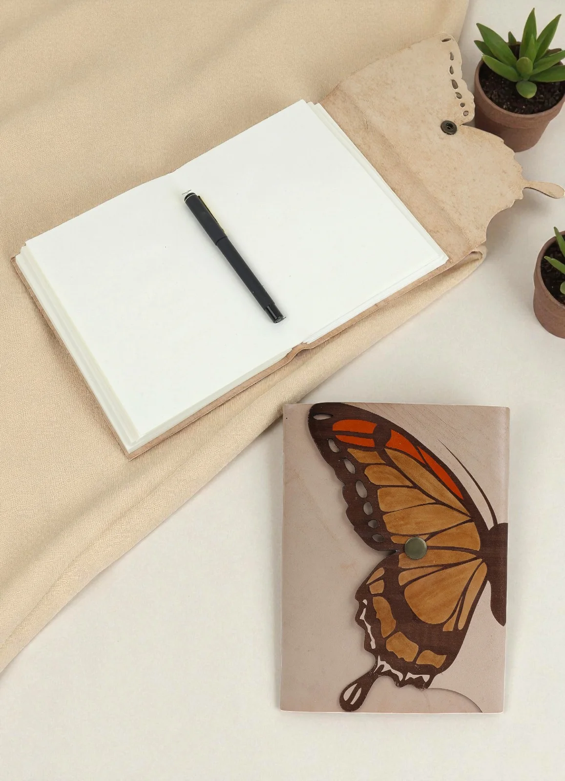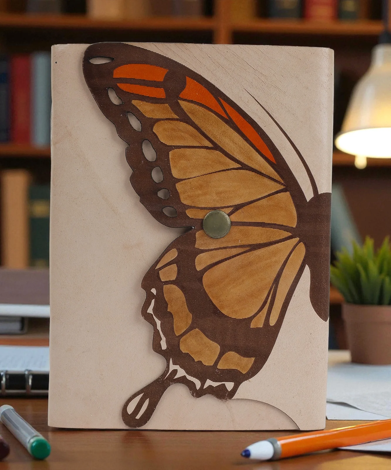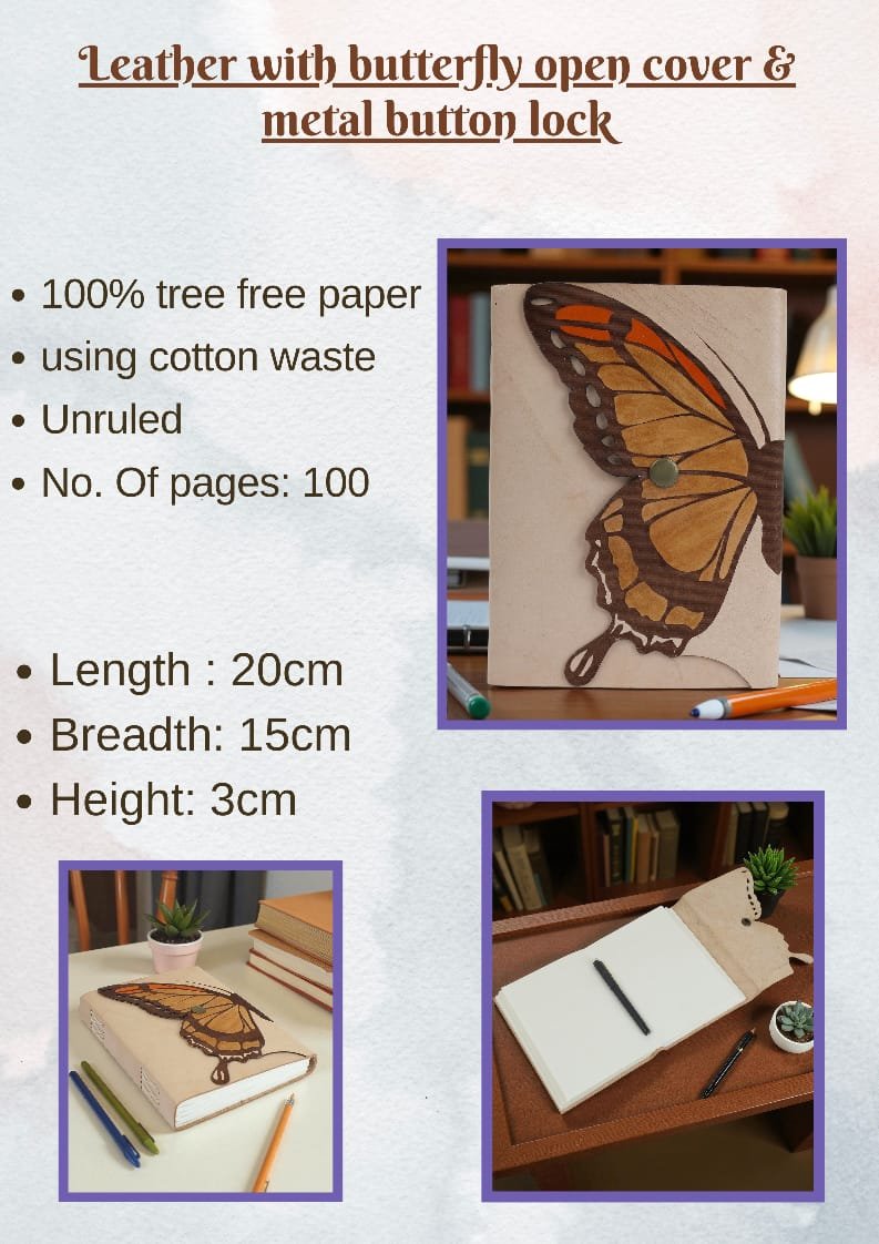 A handcrafted eco-friendly leather notebook with a butterfly cover, metal lock, and 100 tree-free unruled pages for writing and creativity.