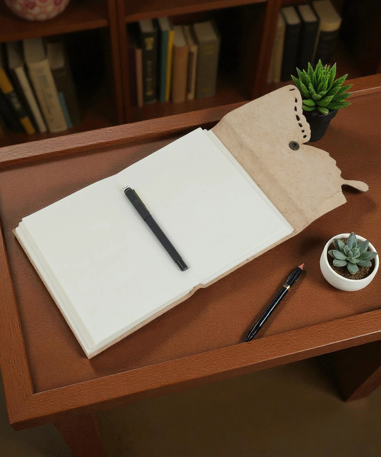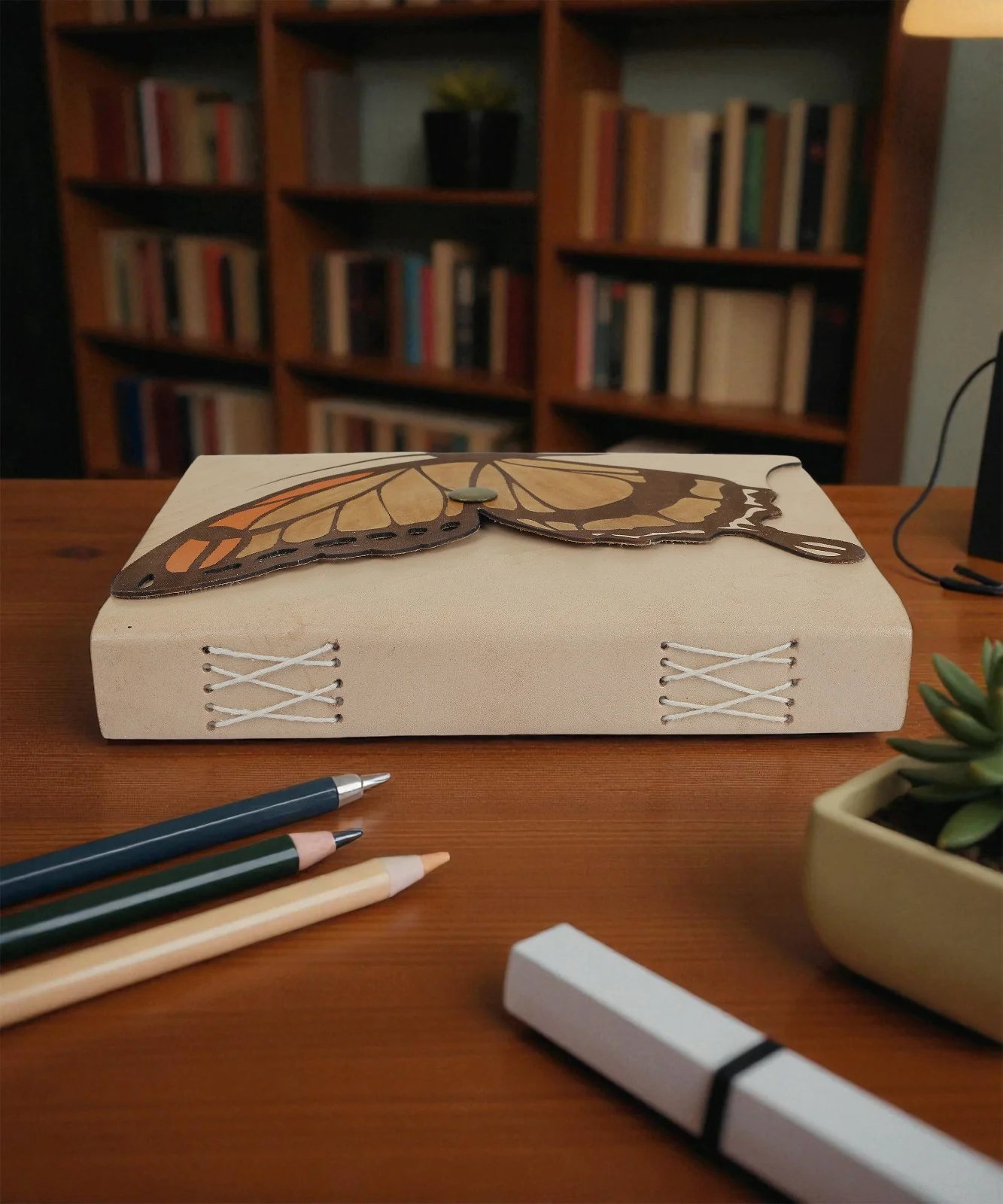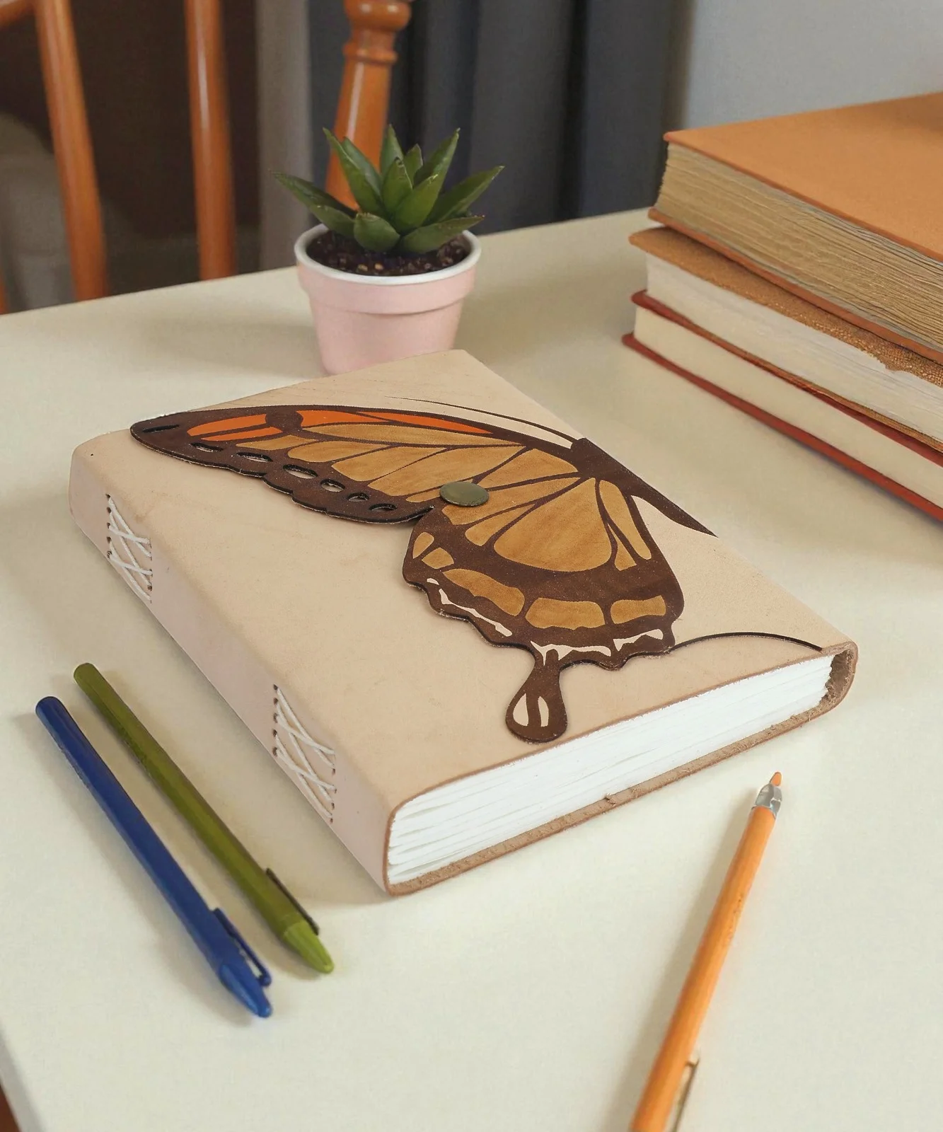 A handcrafted eco-friendly leather notebook with a butterfly cover, metal lock, and 100 tree-free unruled pages for writing and creativity.