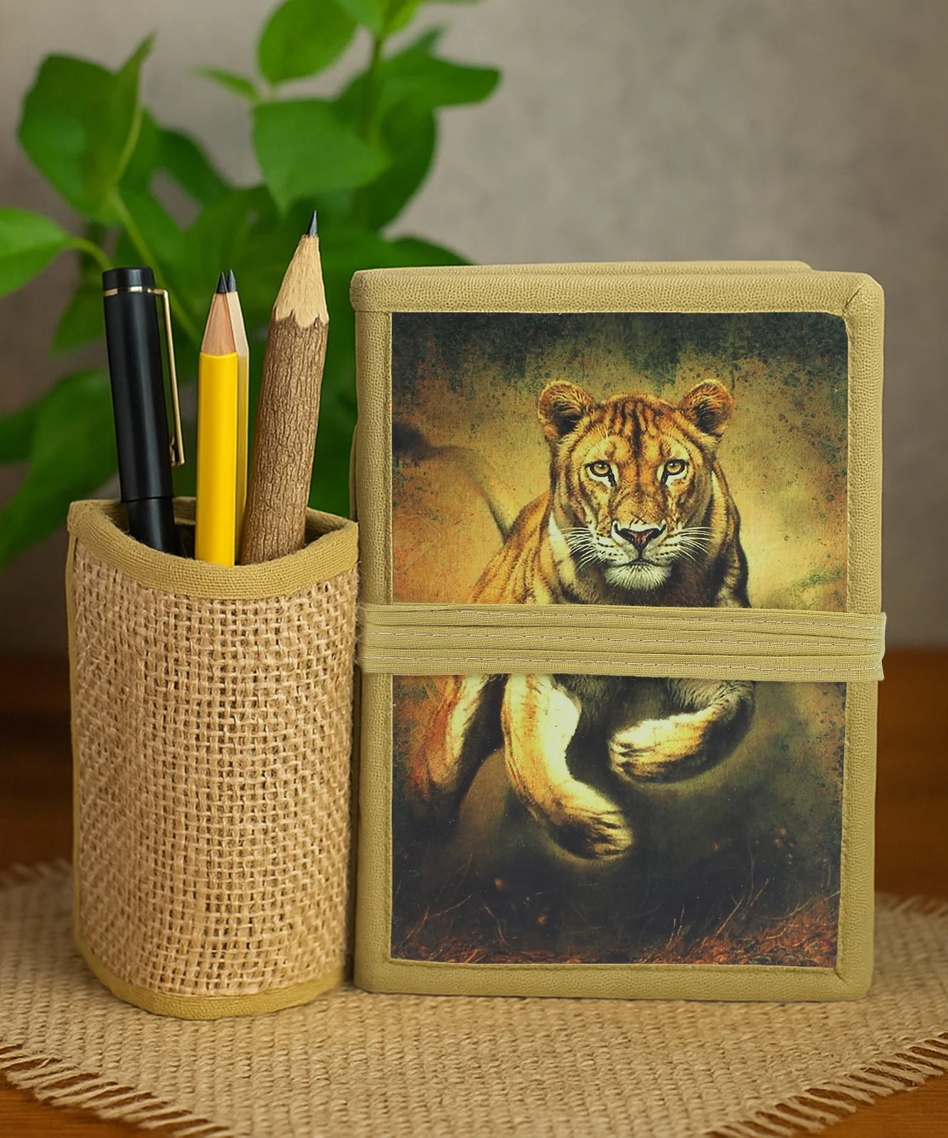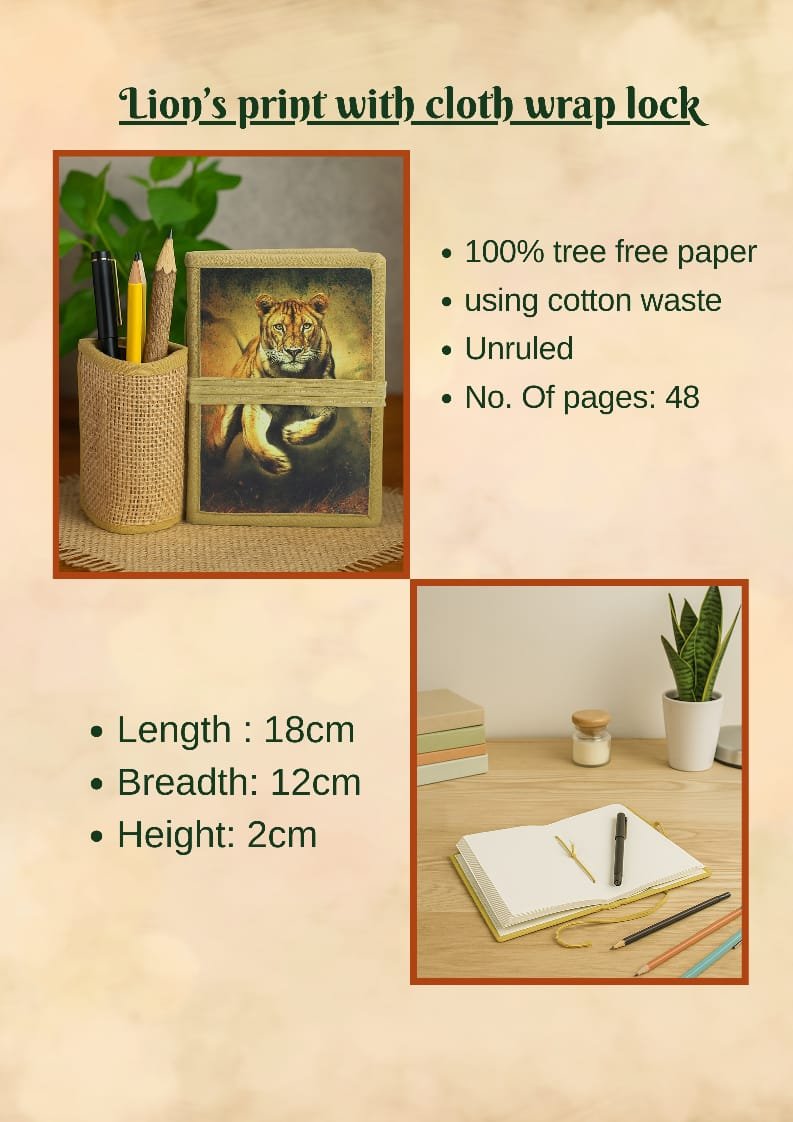 A striking journal featuring a bold lion print and a soft cloth wrap lock, crafted with eco-friendly cotton-waste paper.