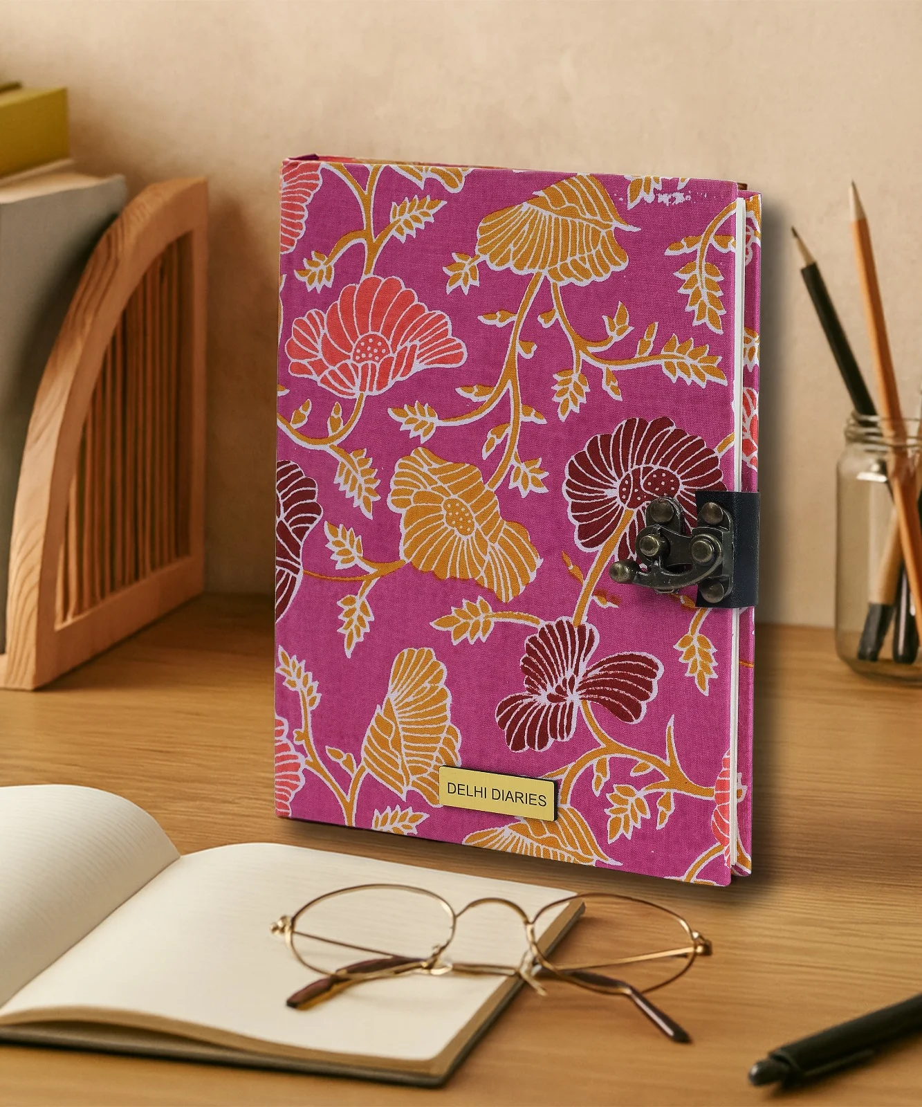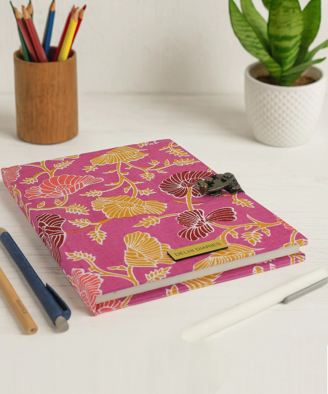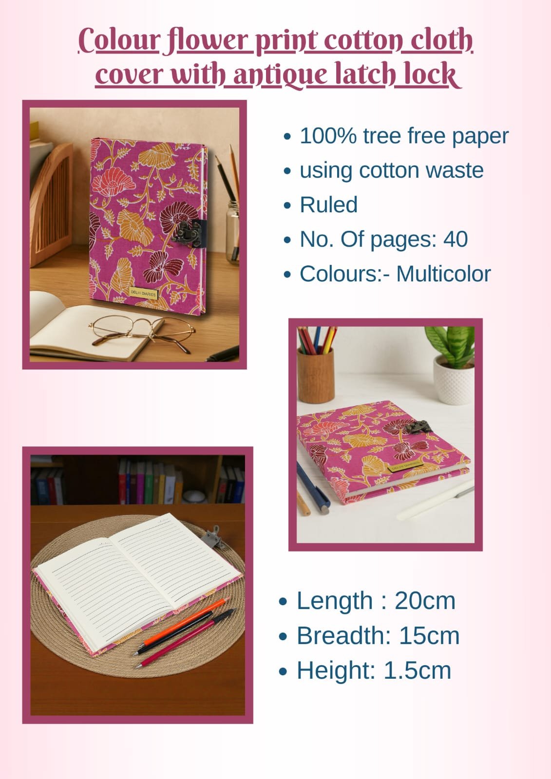 A vibrant multicolor cotton-cloth diary featuring floral prints and a vintage-style antique latch lock.