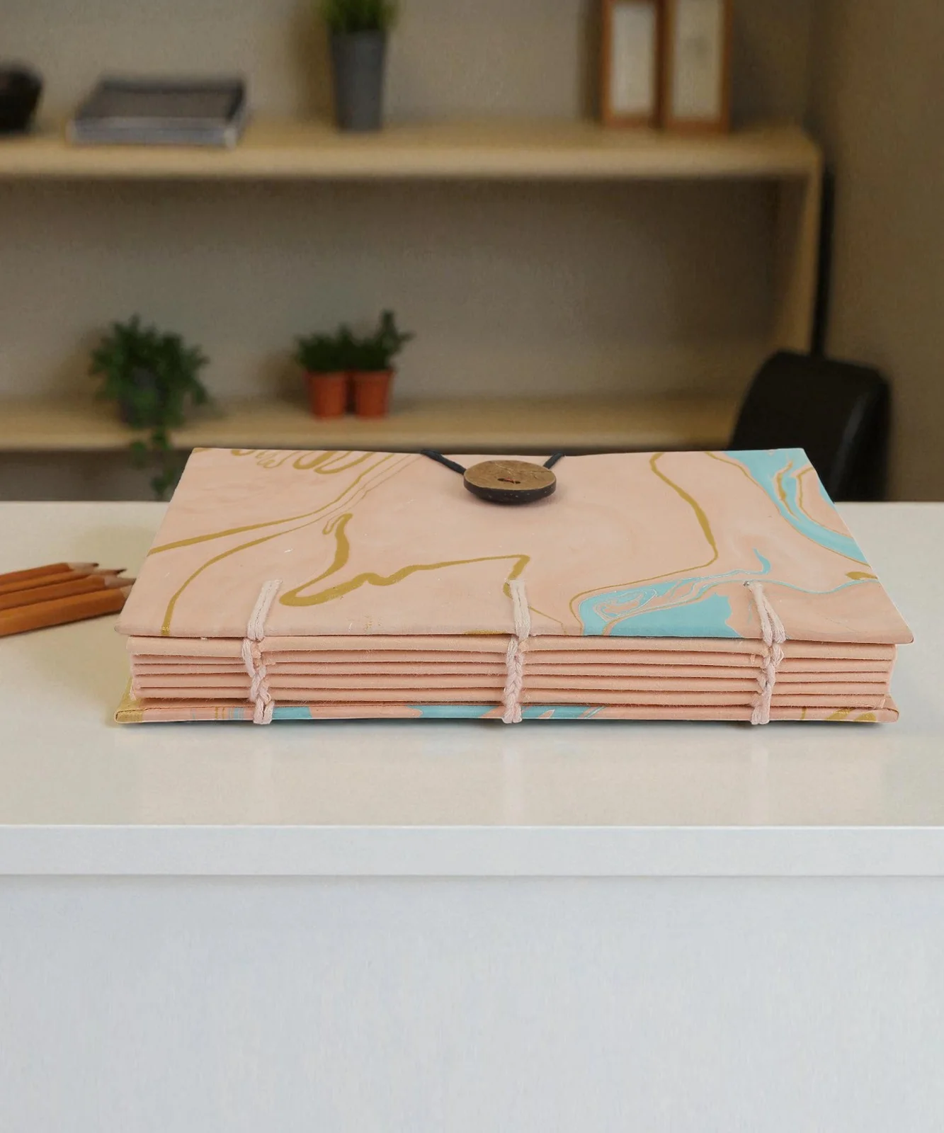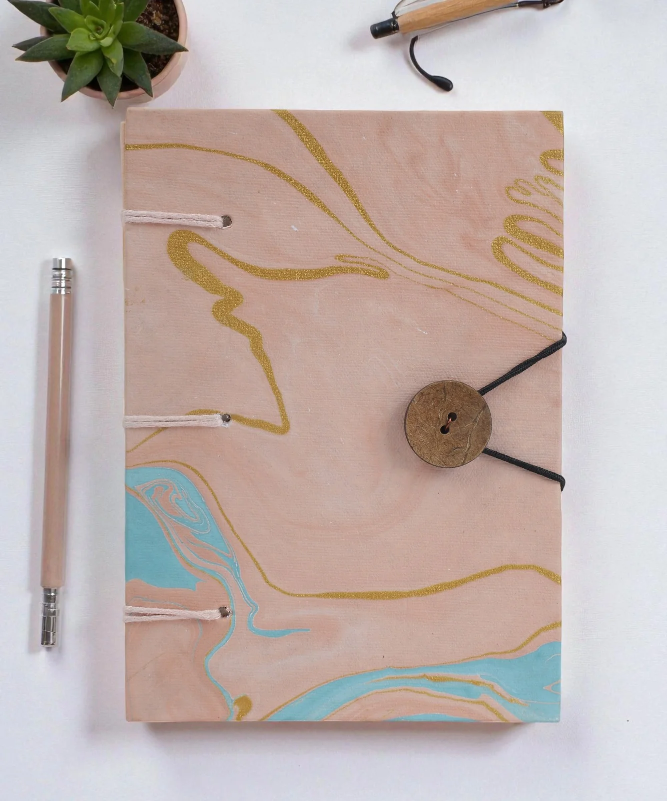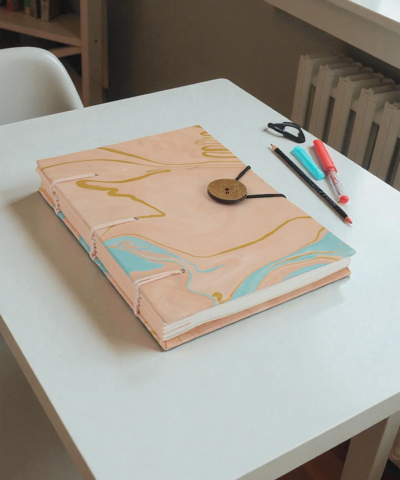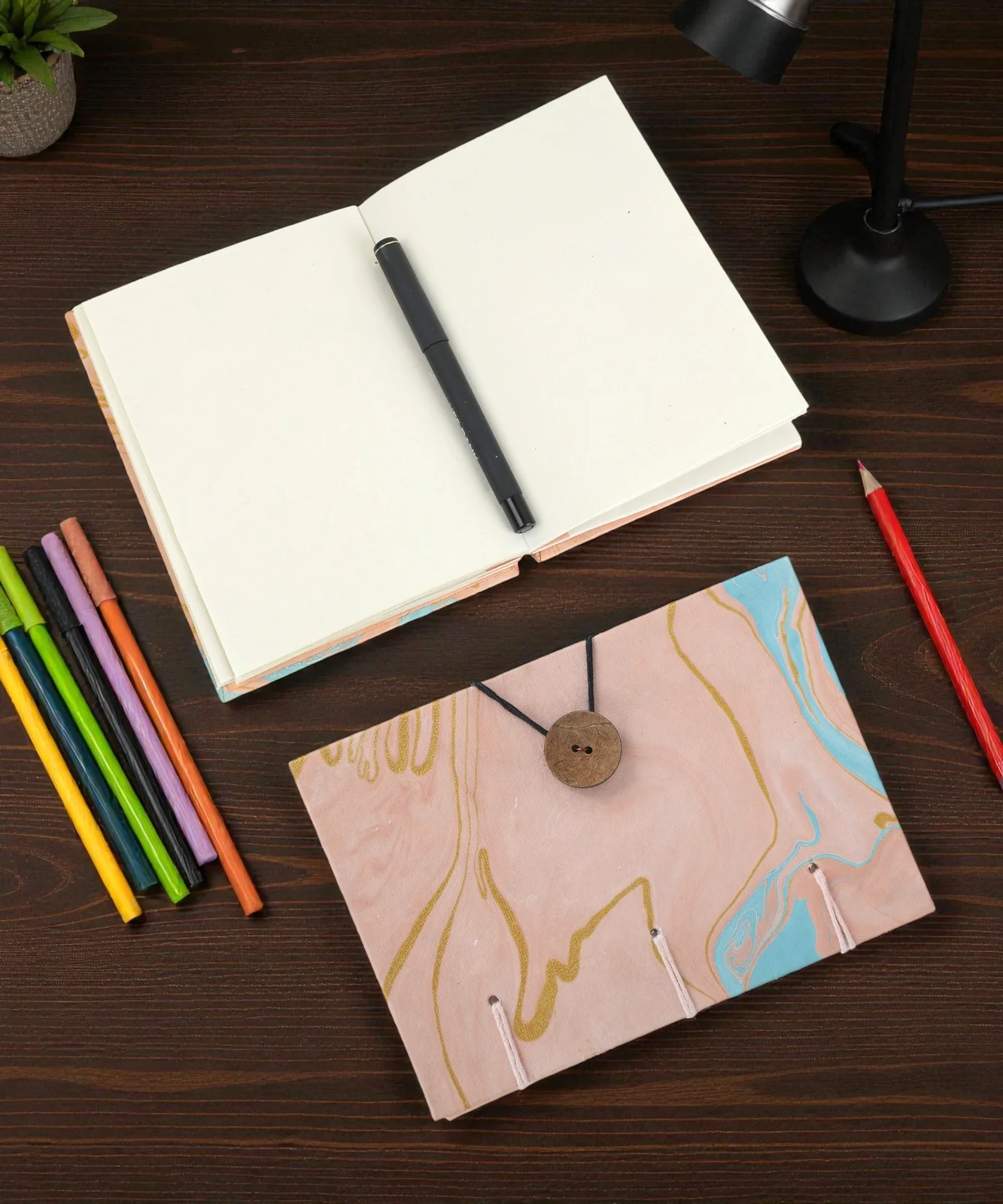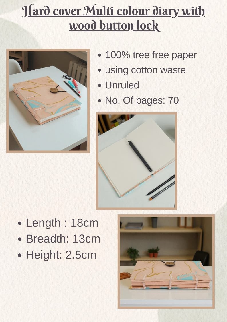 A handcrafted multicolor hard-cover diary featuring a natural wood-button lock and premium unruled eco-friendly pages.