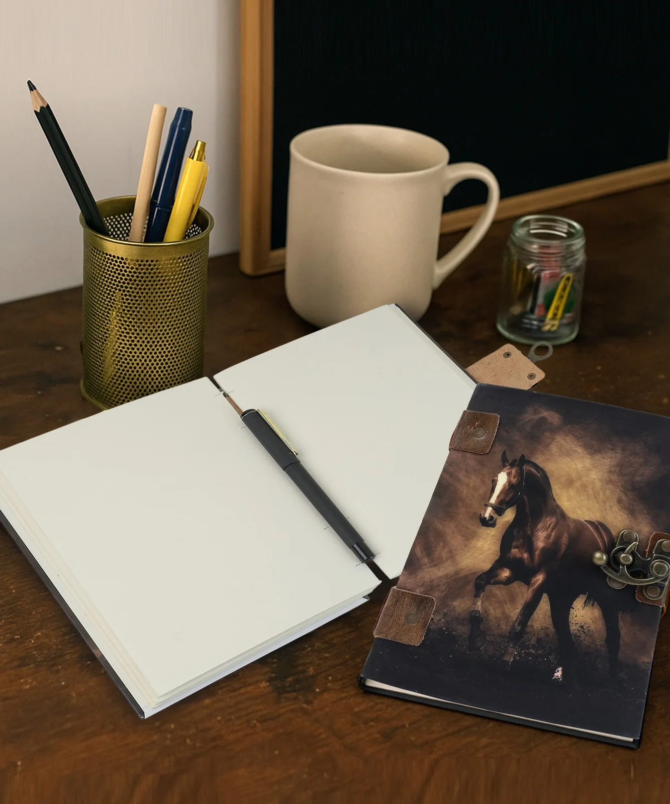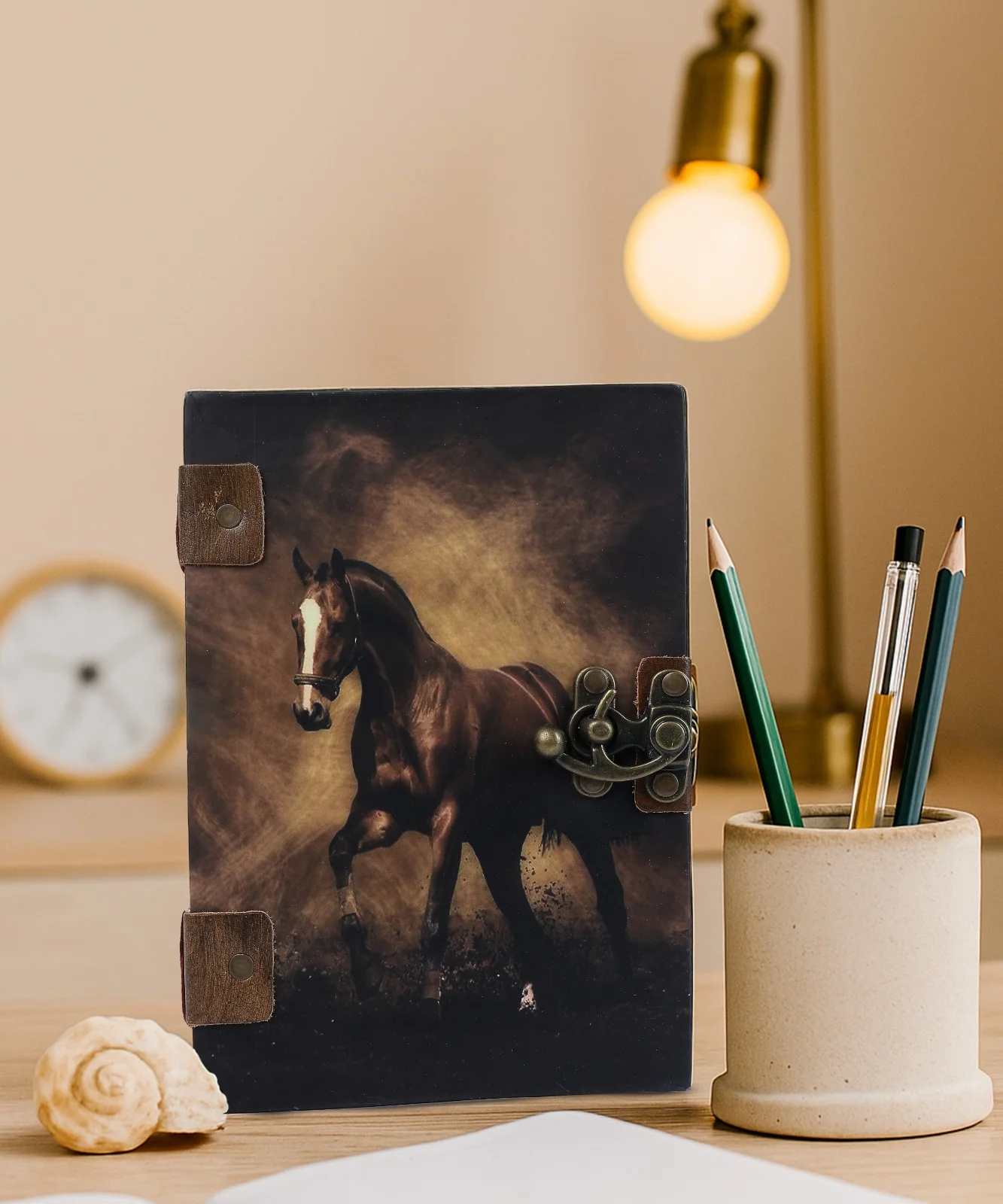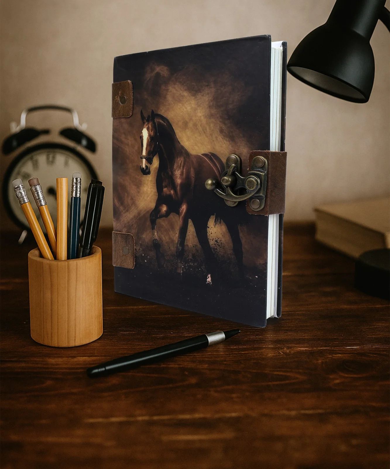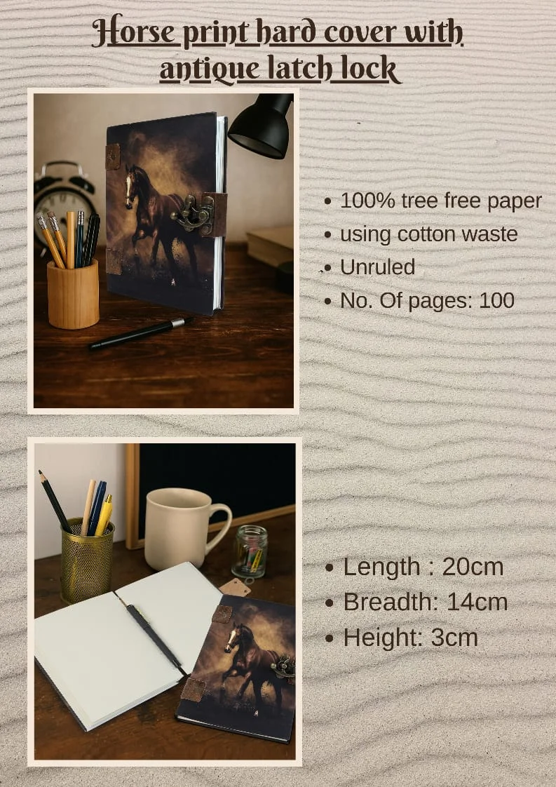 Premium horse-print hard-cover diary with antique latch lock and eco-friendly unruled pages for journaling and sketching.