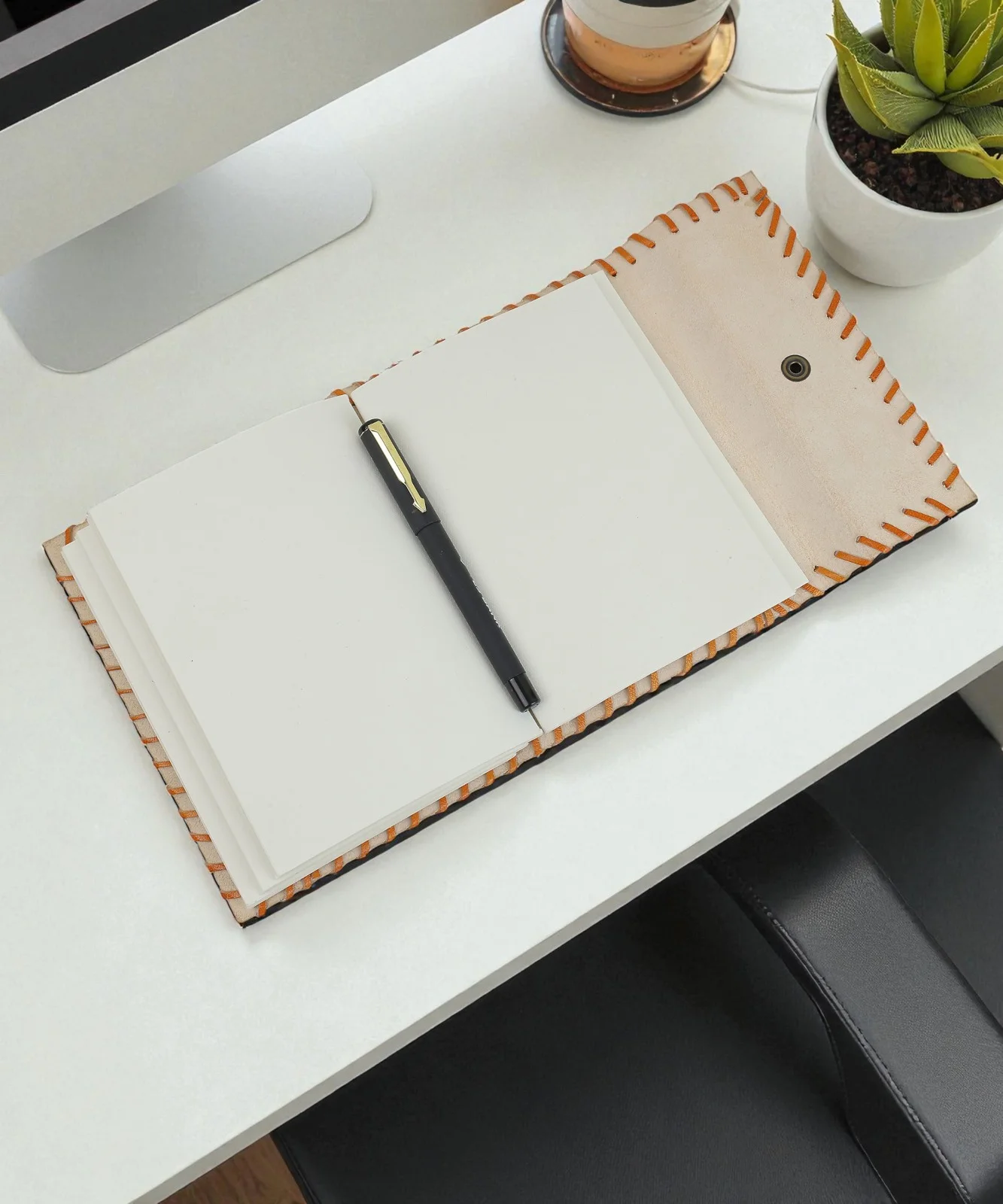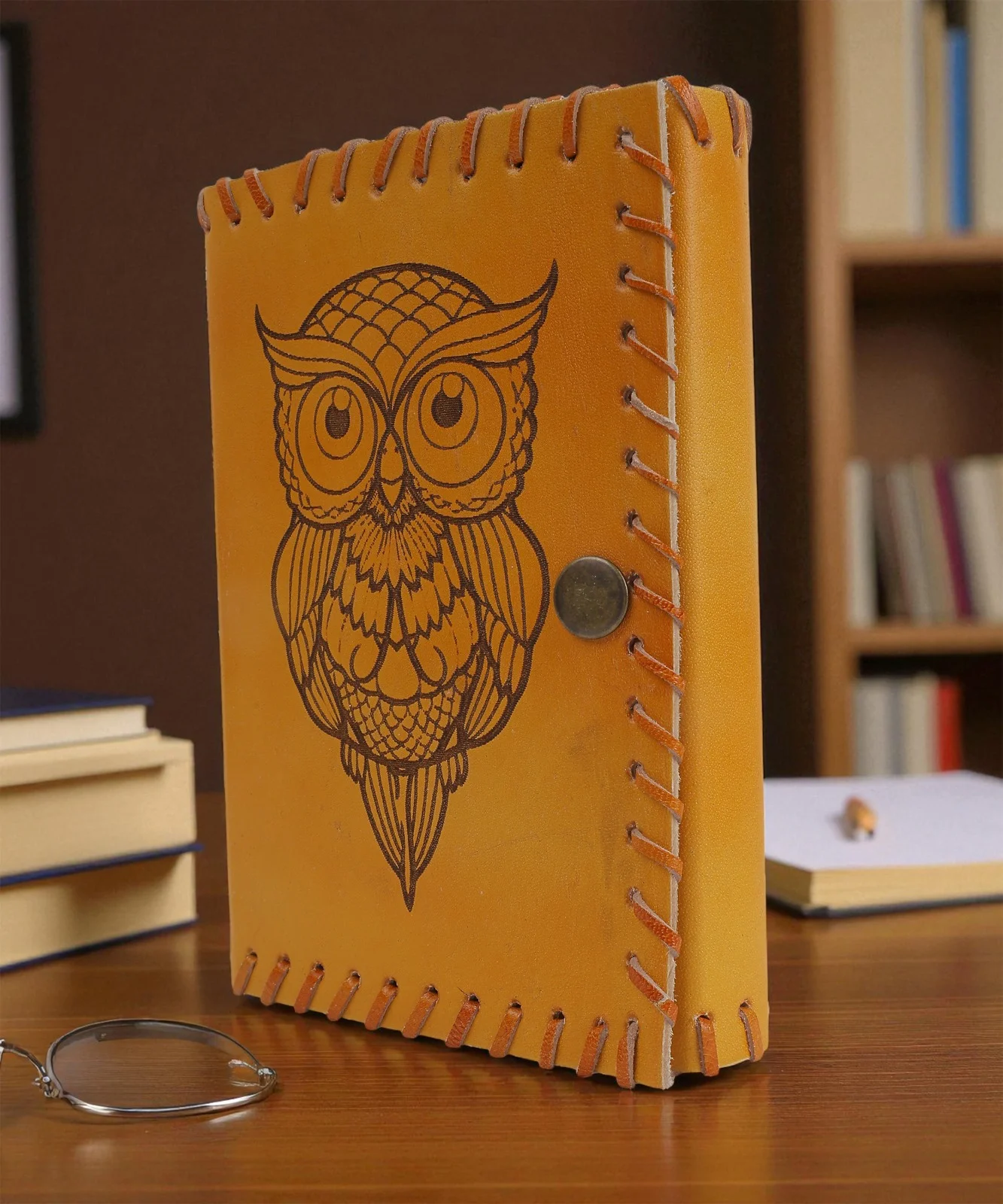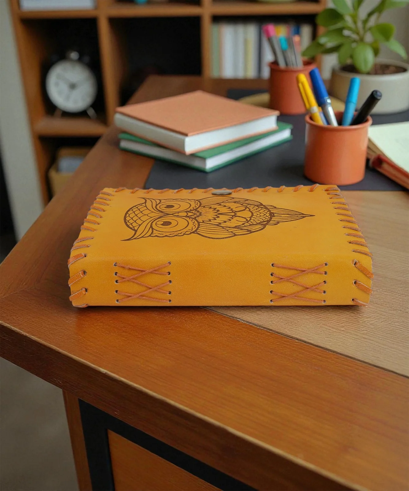Elegant handcrafted leather diary with owl engraving, stitched edges, and a metal button lock made using eco-friendly cotton-waste paper.