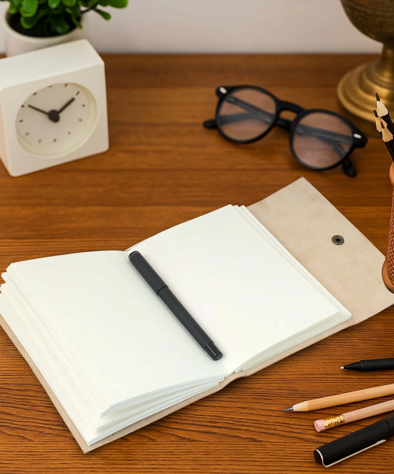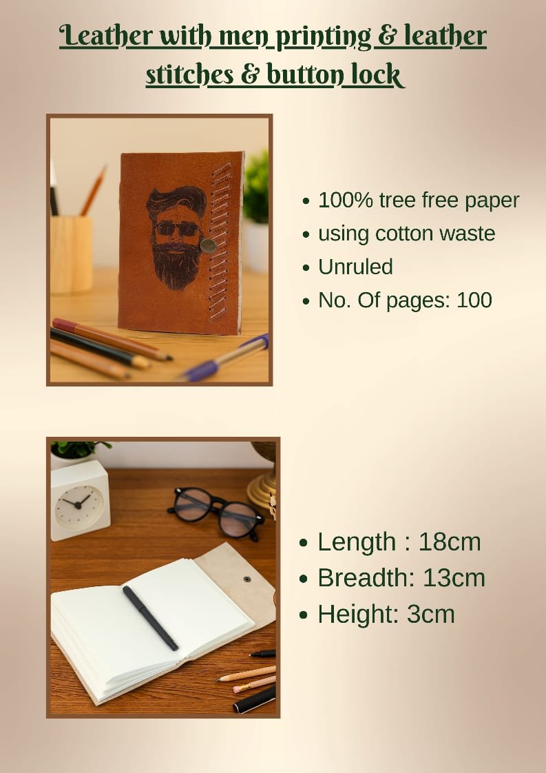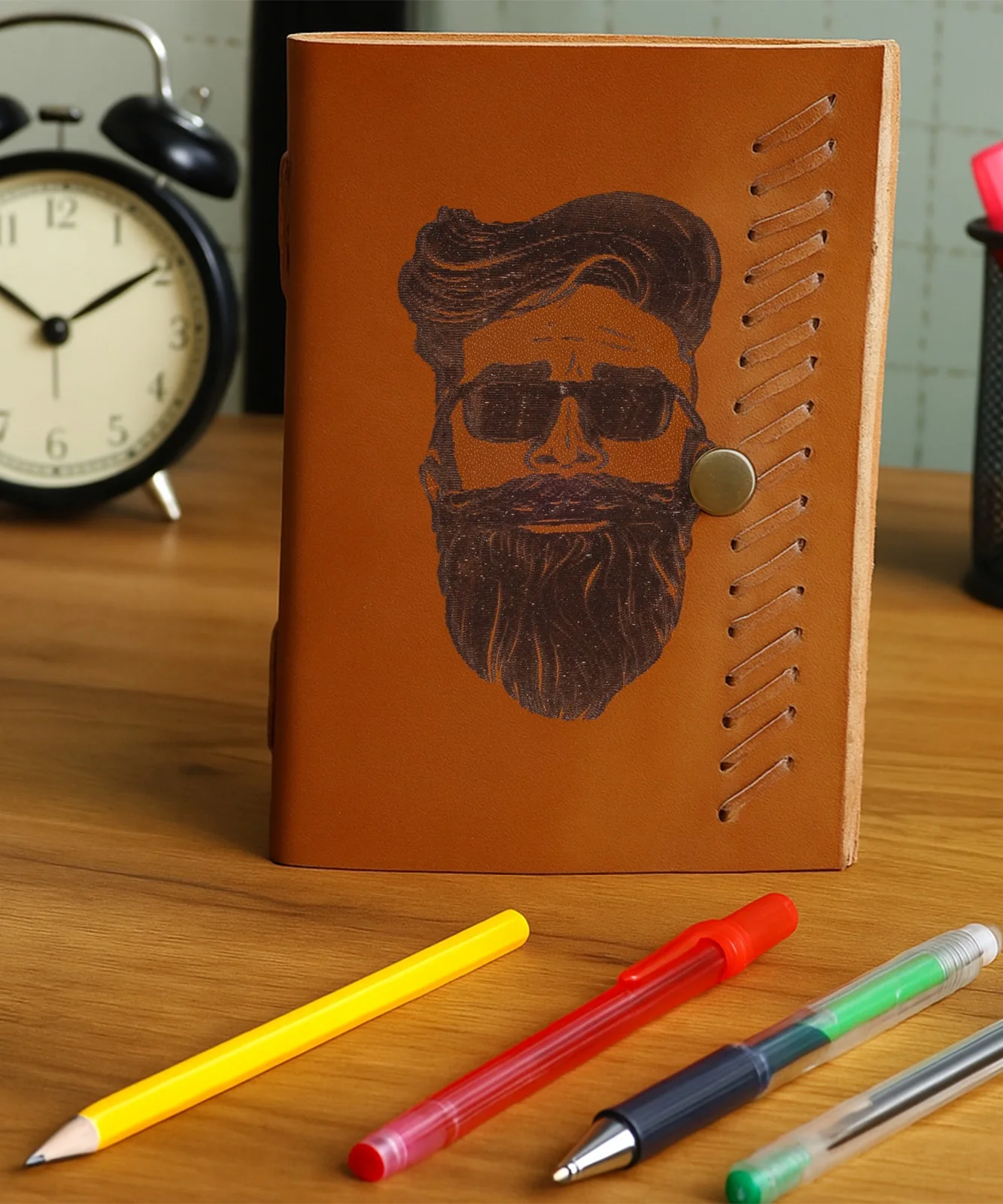 A handcrafted leather journal with artistic embossing, durable stitches, and an eco-friendly cotton-waste paper interior.