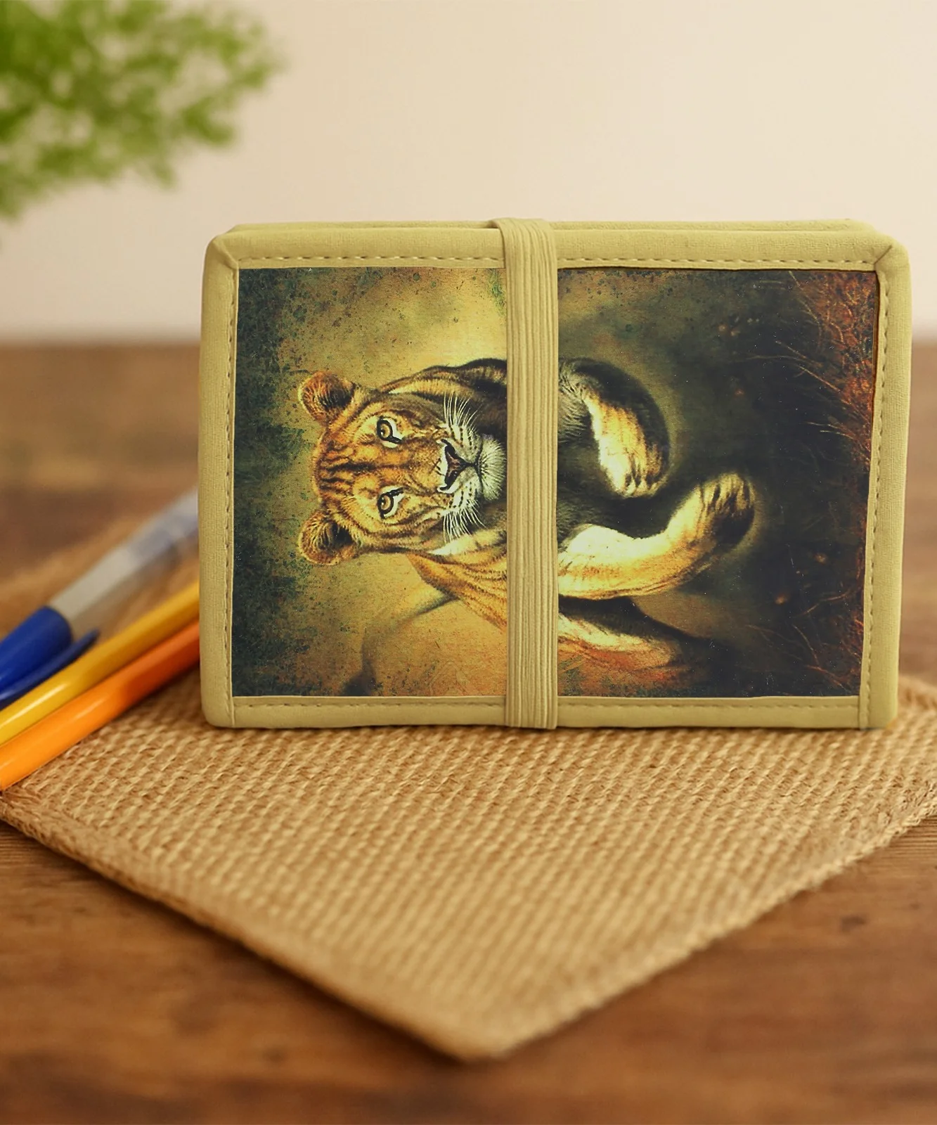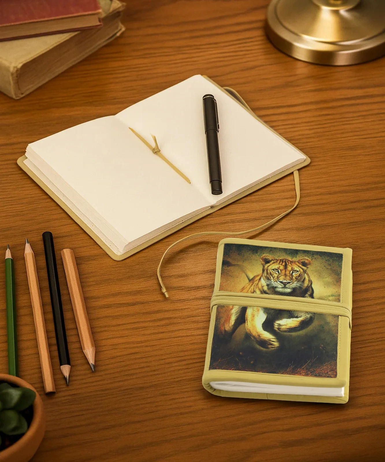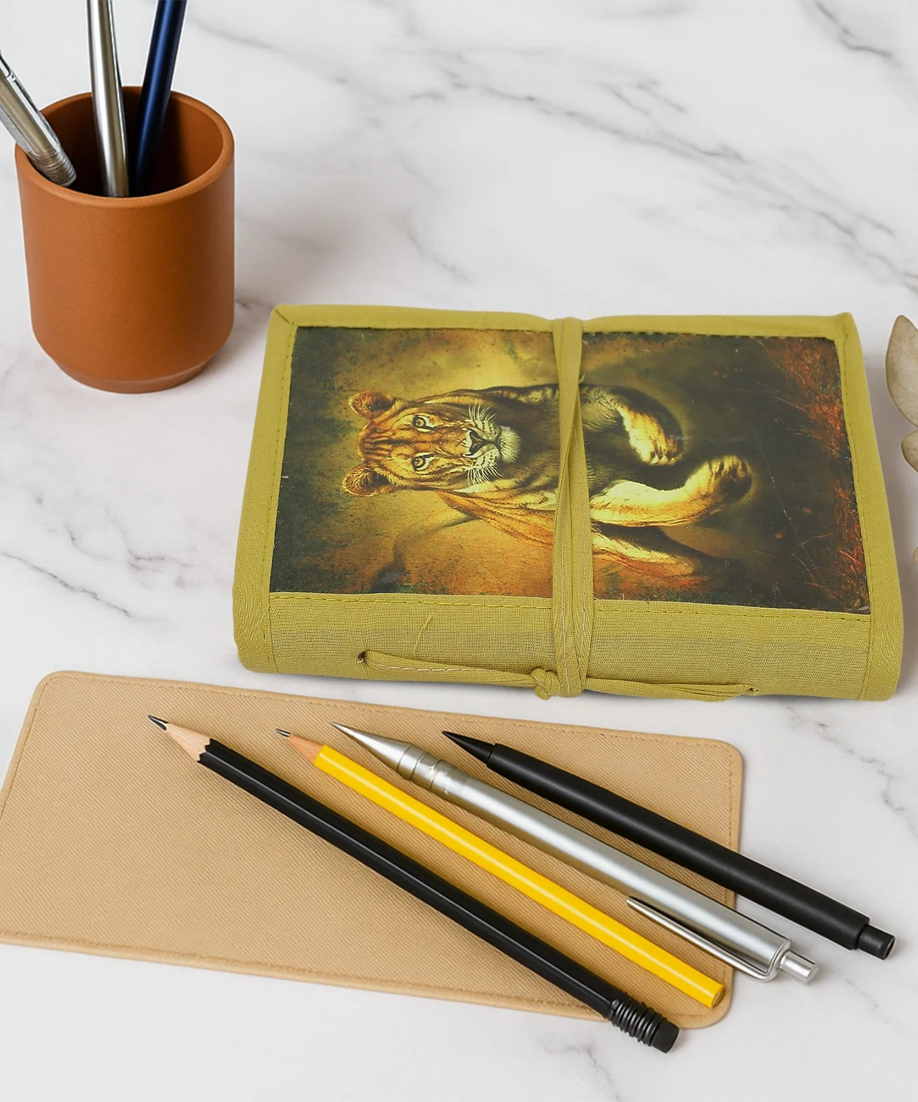 A striking journal featuring a bold lion print and a soft cloth wrap lock, crafted with eco-friendly cotton-waste paper.