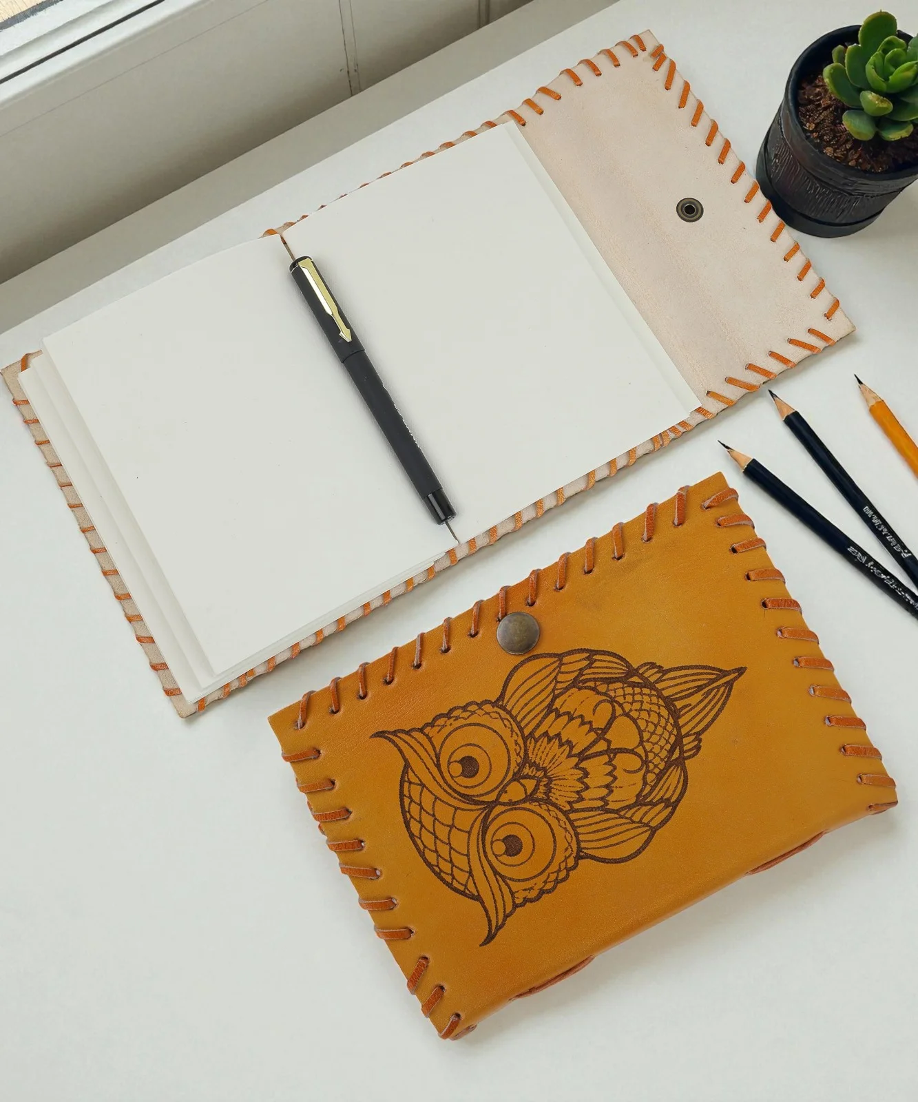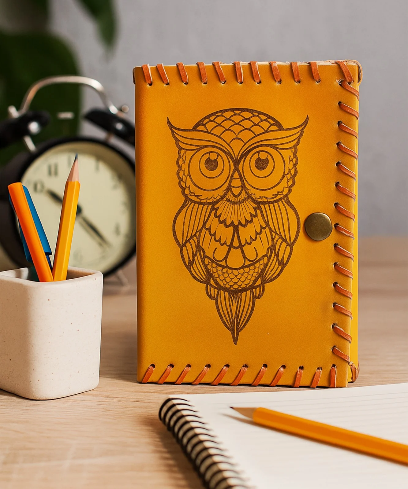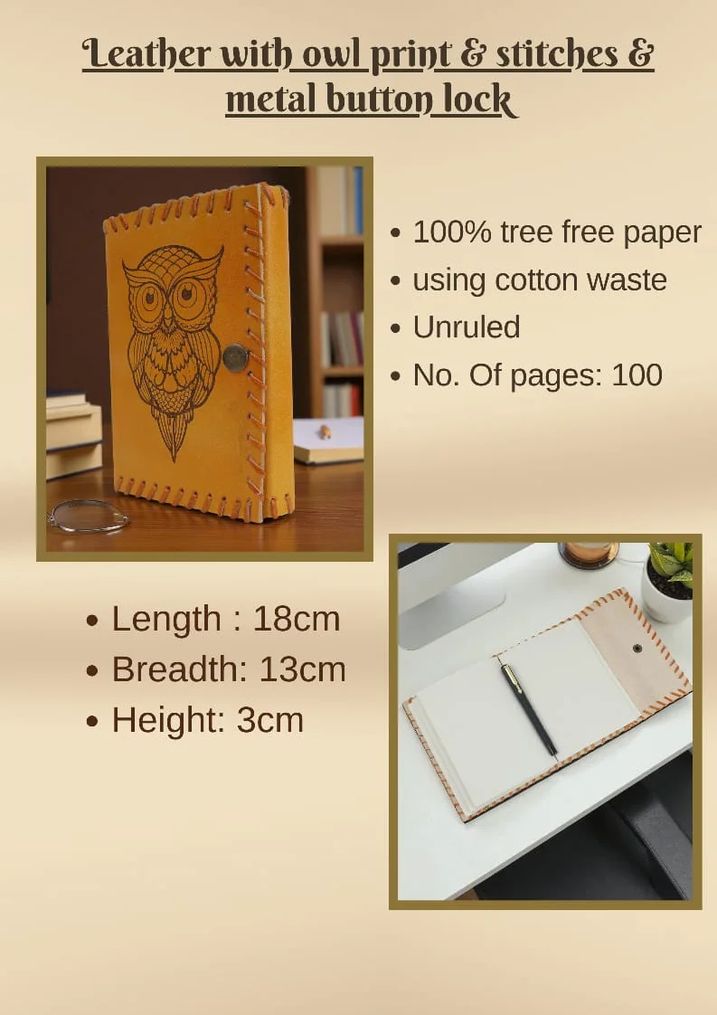 Elegant handcrafted leather diary with owl engraving, stitched edges, and a metal button lock made using eco-friendly cotton-waste paper.